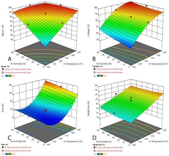 Three design factors—temperature, humidity, and fan rotation speed—were used as quantitative autonomous variables to examine their impact on the degree of denaturation of myosin, collagen, actin, and cooking loss. These independent variables were assessed across the following ranges: 140–190 °C for temperature, 0–60% for humidity, and 0–1400 rpm for fan rotation speed The parameter ranges were determined based on the literature research and preliminary studies [2,14,26]. The software application Design Expert version 11 (Stat-Ease, Inc., USA) was employed to conduct 20 experiments (see Table 1). A quadratic equation was selected to illustrate the connections between the variables and responses. The model’s central point was duplicated six times for accuracy.
