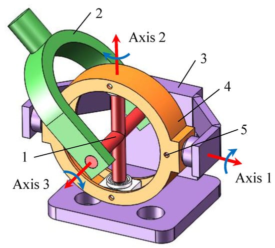 The reconfigurable (Rc)PU limb is formed by the reconfigurable circular groove cross joint (Rc joint), a P pair (prismatic pair), and a U pair (universal joint). The limb switches between different motion modes based on the evolutionary rule (4) of the metamorphic mechanism [8]. As shown in Figure 1, the Rc joint has three axes of rotation at the same central point: the outer axis (Axis 1), the inner axis (Axis 2), and the side axis (Axis 3). The motion characteristics of the Rc joint are changed by altering the angle and configuration between the outer axis and the inner axis. The outer axis (Axis 1) is a fixed axis; its direction is unchanged, and the inner ends of the outer axis are connected to a circular groove through a revolute pair. The inner axis (Axis 2) is placed inside the circular groove, where it can rotate, and then the angle between the inner axis and the outer axis is changed; the position of the inner axis in the circular groove can be determined with the positioning hole.