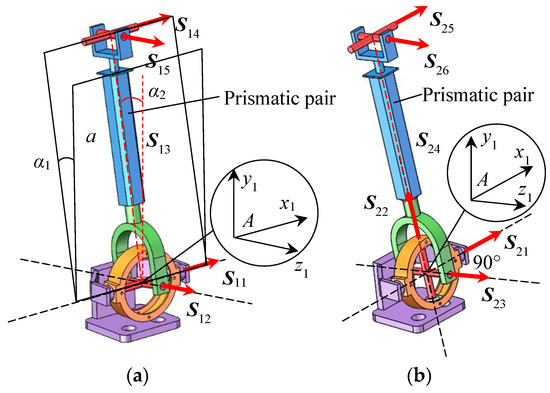 In the evolution of mechanisms, constraints are the decisive factor. Taking the (Rc)PU limb moving to a certain angle as the initial state of the limb, the geometric constraints of two different isomorphic states in the initial state of the limb are analyzed. As shown in Figure 2a, a local coordinate system A-x1y1z1 is established at the center A of the circular groove of the Rc joint. The outer axis of the Rc joint is in the direction of the x1 axis, the perpendicular direction of the joint support base is in the direction of the y1 axis, the vertical direction of the joint support side wall is in the direction of the z1 axis, and the distance between the center of the Rc joint circular groove and the U pair is a (constant). Then, the kinematic screw system of the (Rc)1PU limb can be expressed as follows: