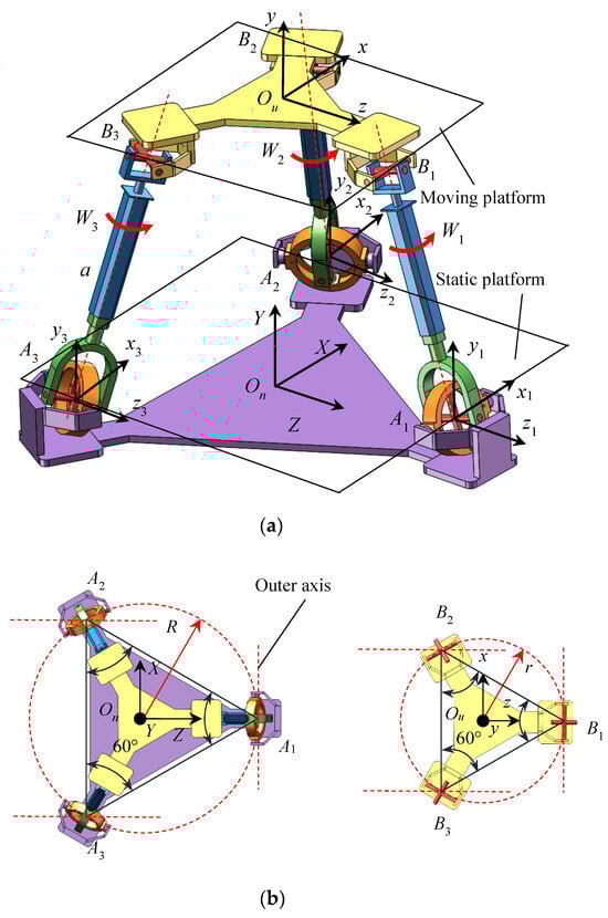 The configuration of the 3(Rc)PU PM: (a) the coordinate systems of the 3(Rc)PU PM; (b) the distribution of the kinematic pairs on the static platform and the moving platform.