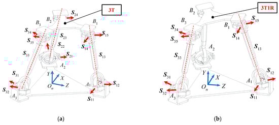 Equation (27) is the set of transmission wrench screws obtained by locking the actuated joints on each limb. Among them, ST1, ST2, and ST3 are the transmission wrench screws corresponding to the prismatic input actuated joints on limbs I, II, and III, and ST4, ST5, and ST6 are the transmission wrench screws corresponding to the input actuated joints on the outer axis of limbs I, II, and III.