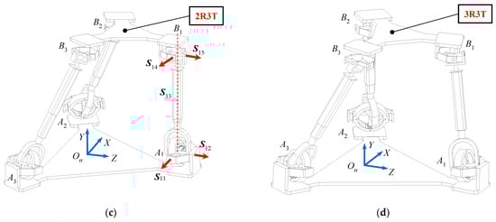 The kinematic description of the reconfigurable PM’s moving platform in the 2R3T motion branch is shown in Figure 4c. At this time, the moving platform has three translation degrees of freedom along the X axis, Y axis, and Z axis and two rotation degrees of freedom.