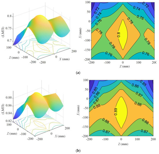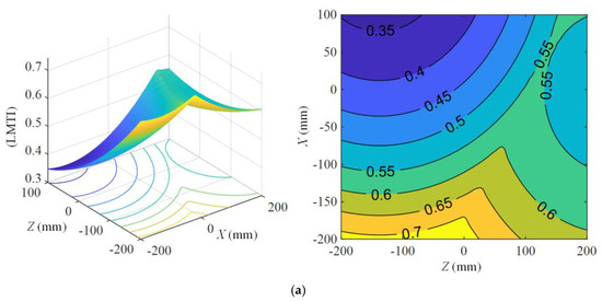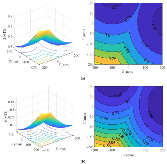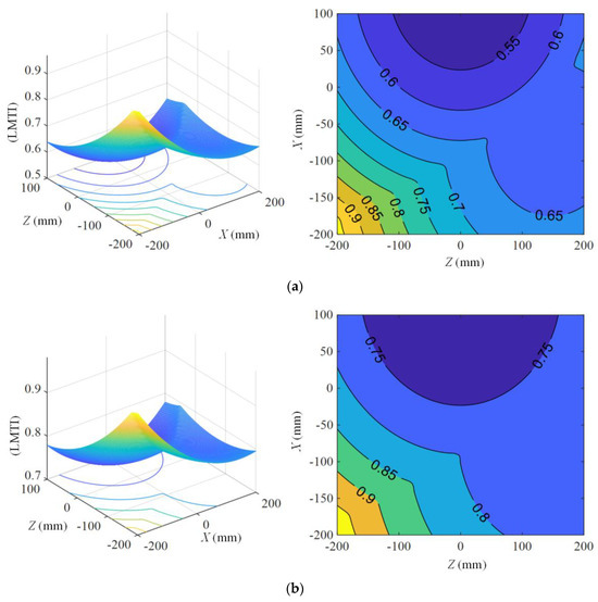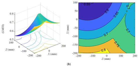 The LMTI distribution curve of the 3R3T motion branch: (a) α = 30°, β = 30°, γ = 30°, Y = −400 mm; (b) α = 30°, β = 30°, γ = 30°, Y = −600 mm.