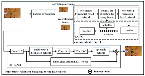 In this paper, a frame super-resolution-based end-to-end rate control is proposed in DCVC. Different from the traditional hybrid coding framework, the key coding parameters of the multi-scale-based end-to-end rate control are predicted using various convolutional neural networks. Firstly, the original video is processed by employing the multi-scale bicubic downsampling operation to greatly reduce video data. For end-to-end rate control, the suitable bit rate ratio for every frame is predicted using the two-branch residual-based network according to the temporally encoded parameters. Moreover, the optimal λ can be obtained using the two-branch regression-based network according to the temporally encoded feature in order to balance distortion and the bit rate. Finally, for restoring the high-resolution frame, HEDS-Net is designed, which contains a multi-branch distillation network, the lightweight attention LCA block, and the upsampling network, to generate the detailed features of the upsampling frame. The experimental results show that the proposed algorithm can achieve a PSNR BD-rate of −1.24% and SSIM BD-rate of −0.50%, with 1.82% rate control accuracy.