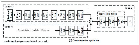 To predict the Lagrange multiplier λ of the current frame, a two-branch regression network is designed in Figure 4. Since the residual feature of a frame, which is the difference between the predicted and original frames, can indicate the correlation between the adjacent frames, the residual frame is used as an input of the up branch. The bit allocation of the current frame calculated via Equation (14) and the bit cost and distortion and of the previously encoded frame are used as inputs of the down branch. Then, the fusion features of the two branches are inputted into the regression block. Finally, the optimal λ value of the current frame can be predicted using the network.