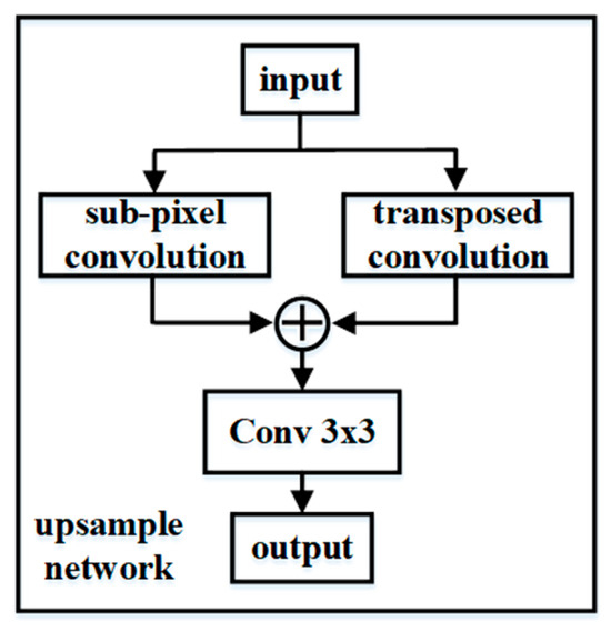 The upsampling network is mainly used to polymerize the low-frequency frame feature. Two branches are used for the upsampling network. The left branch of the sub-pixel convolution carried out pixel rearrangement. The right branch of the transposed convolution implements the feature transform. The fusion of the two branches will improve the diversity of the upsampling feature. The upsampling network is shown in Figure 7.