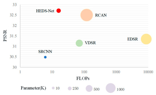 The visualization map of the PSNR indexes for Set5 at the ×4 scale is shown in Figure 9. From Figure 9, it can be seen that HEDS-Net has the best restoration performance with low complexity and a few parameters. This also verifies the high computational efficiency of HEDS-Net.