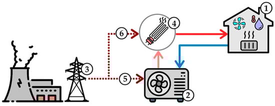 Diagram of the cooperative system involving an air source heat pump (AHP) with an electric heater in a monoenergetic system. The components are labeled as follows: 1—building installations; 2—air source heat pump (AHP); 3—electrical grid; 4—electric heater (EH); 5—electric power for the heat pump (NAPH); 6—electric power for the electric heater (EHM). This layout illustrates the flow of energy and the integration of components necessary to maintain efficient heating within the building.