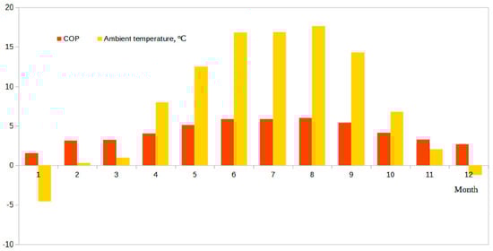 Figure 2 shows the variation of the COP (Coefficient of Performance) with external temperature over the analyzed statistical year. The highest values are achieved during the summer months, when the external temperature reaches its peak for the year.