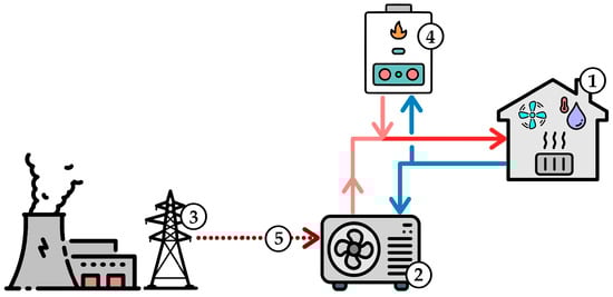 Diagram of the cooperative system between the heat pump (AHP) and the gas boiler (GB) in a bivalent system, where: 1—building installations; 2—heat pump (AHP); 3—electrical grid; 4—gas boiler (GB); 5—electric power for the heat pump (NAPH).