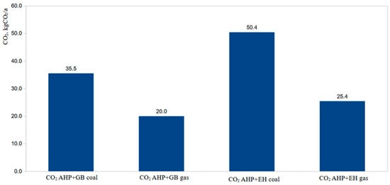For the AHP + EH system, all the electricity comes from the power plant, for which an energy input factor of 3.0 is assumed [34]. For the AHP + GB system, the energy input factor for electricity from the power plant is also 3.0, but for gas-generated energy locally produced in the gas boiler, an input factor of 1.3 is assumed [34]. The emission of gas is the product of energy consumption, the energy input factor, and the unit CO2 emission.