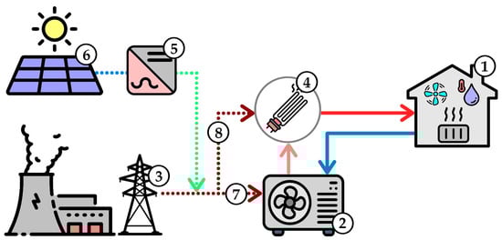 Figure 1 illustrates the schematic of the analyzed baseline system. It is assumed that the air source heat pump (AHP) will operate with an electric heater in a monoenergetic system to ensure continuous heat supply for the building. The electric heater activates when the coefficient of performance (COP) for heating drops below 2.8. This value was selected as the minimum due to the economic efficiency of the AHP operation, given current electricity prices.