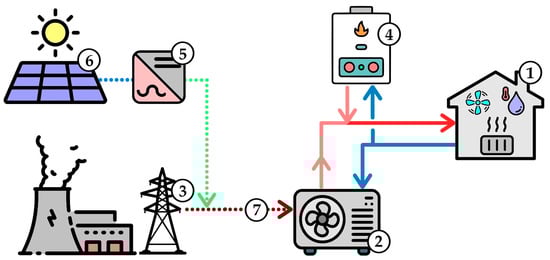 Diagram of the cooperative system between the heat pump (AHP) and the gas boiler (GB) in a bivalent system, where: 1—building installations; 2—heat pump (AHP); 3—electrical grid; 4—gas boiler (GB); 5—inverter; 6—photovoltaic panels (PV); 7—electric power for the heat pump (NAHP).