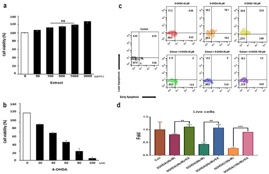 Cellular viability and apoptosis of Allium senescens extract and 6-OHDA in neuroblasts. (a,b) Cellular viability of neuroblasts treated with extract and 6-OHDA (p < 0.05). (c) Apoptosis of neuroblasts treated with extract (500); 500 μg/mL and indicated concentrations of 6-OHDA. (d) Histograms showing relative fold changes in number of live cells under treatment with extract and 6-OHDA based on the panel (c). ns: not significant, EX: Allium senescens extract 500 μg/mL, 6-OHDA: 6-hydroxydopamine (** p < 0.01, *** p < 0.001).
