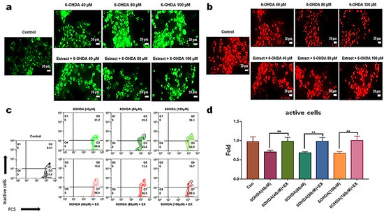 Protective effect of extract for mitochondrial apoptosis of neuroblasts. (a,b) Estimation of mitochondrial membrane potential using fluorescence microscopy. Red and green colors indicate live and dead cells, respectively. (c,d) Flow cytometric counts indicate active and inactive cells in histograms; populations of Q2 regions in the quadrant plots are dead cells, (d) showing the counts of inactivated cells based on the panel (c). EX: Allium senescens extract 500 μg/mL, 6-OHDA: 6-hydroxydopamine (** p < 0.01) (white bars = 20 μm).