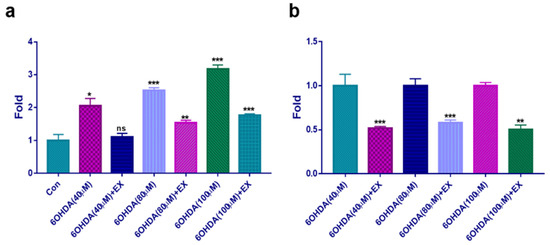 Evaluation of ROS production in neuroblasts treated with the extract. (a) ROS production under various conditions. (b) Relative fold changes derived from panel (a) comparing ROS production in cells exposed to various concentrations of 6-OHDA and treated with the extract. Con; control, EX: Allium senescens extract 500 μg/mL, 6-OHDA: 6-hydroxydopamine, ns: not significant (* p < 0.05, ** p < 0.01, *** p < 0.001).