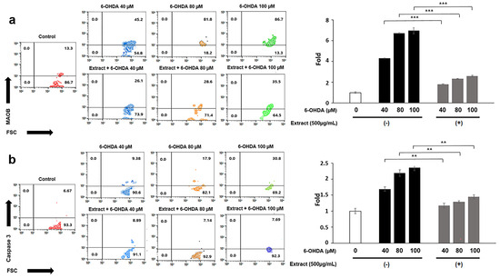 Although 100 μM 6-OHDA enhanced ROS production in neuroblasts, treatment with the extract attenuated this enhancement by a factor of approximately 2 under all concentrations of 100 μM 6-OHDA (Figure 3). An increase in ROS derived from 100 μM 6-OHDA enhanced the upregulation of MOB in neuroblasts (Figure 4a). Despite the activation of MAOB expression by 6-OHDA in neuroblasts, the extract effectively suppressed this upregulation in cells exposed to 80 and 100 μM 6-OHDA (Figure 4a). The degree of suppression was approximately threefold lower compared to cells treated with 6-OHDA alone (Figure 4a). In agreement with these results, the levels of Cas3 were 1.8 times lower in cells treated with the extract (Figure 4b).