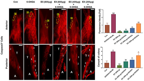 Effects of the extract on mitochondrial apoptosis in the CNS and VC of brine shrimp. Images for whole-mount immunohistochemistry with APC-labeled anti-caspase-3 in the CNS and VC of brine shrimp under 6-hydroxydopamine (6-OHDA) treatment. Histograms show the staining intensity of the cells. The numbers in the posterior regions represent cell colonies. CNS, central nervous system; T, thorax; A, abdomen; ns, not significant; VC, ventral cells, Ext; Allium senescens extract, 6-OHDA; 6-hydroxydopamine (* p < 0.05, ** p < 0.01).