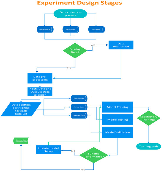 The flowchart of the experimental design stages shown in Figure 2 explains the major stages of the experimental work conducted in this paper. It can be seen that datasets were collected from three sources during the data collection process, and subsequent data preparation and pre-processing ensured data quality. Models were developed in phases based on the aim and objectives of this study. Following the model setup, data splitting and model training, testing, and validation were performed. Details that summarize the stages of the experimental design are presented in Figure 2.