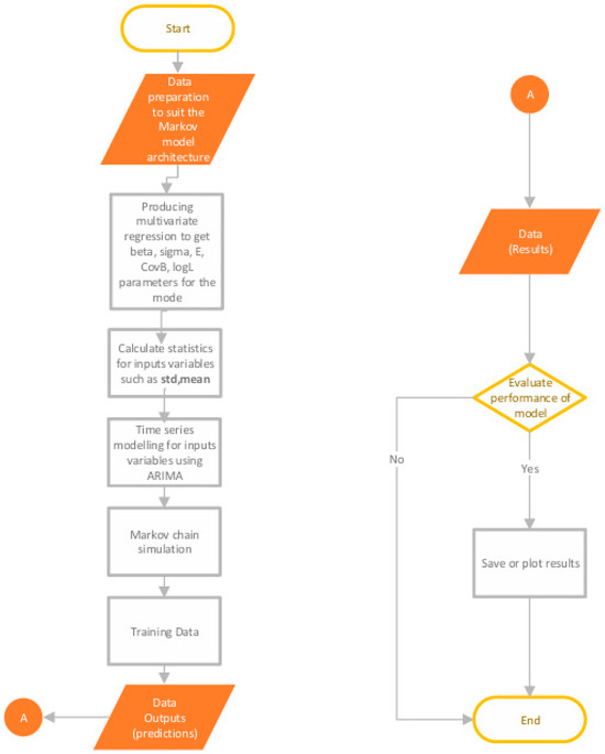 After determining state transitioning, probabilities matrix, and the DTMC object mc using state transition matrix p and state transition models, outputs were simulated using a simulate function with Mdl parameter, with the number of observations represented by a number of rows of outputs and the observed output data. Each output is represented by a simulated function with the specified output parameter. Each simulation function represents one of the outputs to form simulated values for all the outputs. All simulated outputs are stored in one defined variable named (TrainingDatay).