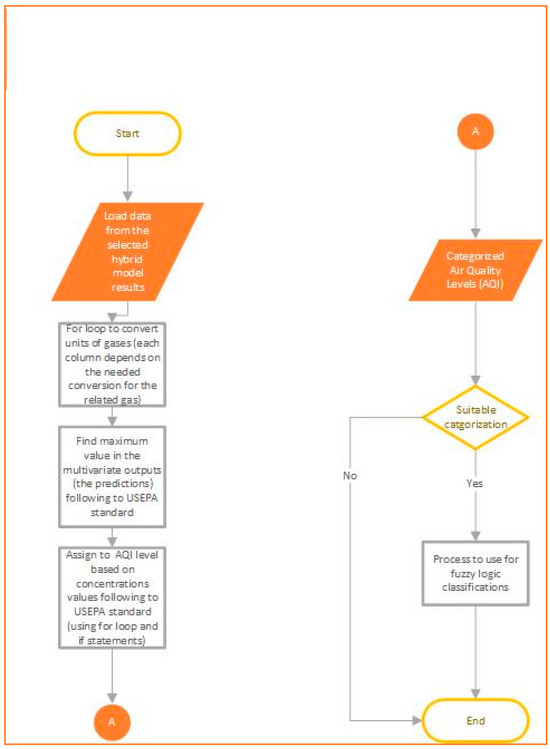 First of all, the outputs were prepared in two parts: one for fuzzy logic (ANFIS) training and the other for fuzzy logic model testing. Training data consist of the raw data that were collected from monitors after pre-processing and preparation, and then each row was assigned to a specific air quality level following the United States Environmental Protection Agency (USEPA) [17] standard, using the flow logic shown in Figure 3. Testing data consist of the predicted outputs explained previously, with the hybrid model and each row then being assigned to a specific air quality level following the USEPA standard, using the flow logic in Figure 5.