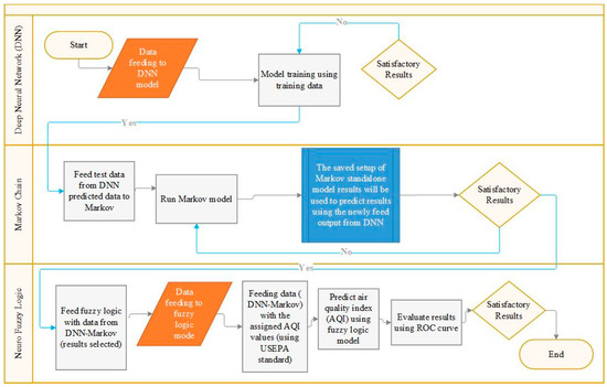 The air quality index prediction process (Figure 6) summarizes the collective experimental framework of this work, consisting of three main parts: the DNN, Markov, and fuzzy logic models. The experiment of this framework started by using the selected results from DNN standalone model-test data, as described earlier in this section. These data were then used as output data for the Markov model, and a run was executed for the already saved results for the Markov standalone model using the test output data from DNN. Afterward, the data from the hybrid (DNN–Markov) model were fed to the fuzzy logic model, and the model results were evaluated.