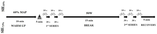 The cycling sprint interval exercise session was performed on a cycle ergometer (Ergomedic Monark 894, Vansbro, Sweden) following the protocol described by Danek et al. [19] and the results are presented in Figure 1. A 10 min warm-up at an intensity of 60% of the MAP (maximal aerobic power) obtained in the incremental exercise test was used, during which 2 × 5 s ‘all-out’ sprints were performed in the 3rd and 6th minutes. The warm-up was a 5-minute passive rest in a sitting position. In the main part, participants performed two series of 3 × 10 s “all-out” efforts with a 30 s activity break between sprints. The break between series was active during 15 min, while the 5 min recovery after the end of the 2nd SIE series was passive. In order to avoid orthostatic collapse, the intervals between sprints and series were performed with 50 W load and a rotation frequency of 50 rpm. A flow chart is presented in Figure 1.