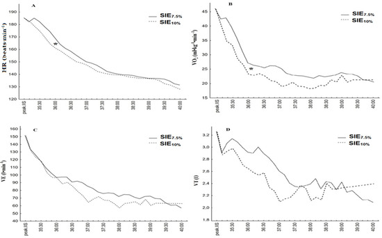 Course of 5 min restitution of HR (A); VO2 (B); VE (C); and VT (D) after SIE with 7.5% (SIE7.5%) and 10% (SIE10%) load relative to body mass. * statistically significant difference (p < 0.05) in the first minute of restitution between conditions.