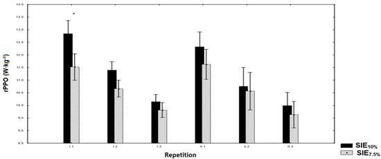 Relative peak power (rPPO) in subsequent repetitions during the SIE session. * statistically significant difference in the first repetition of the 1st series (p < 0.05) between SIE7.5% and SIE10%.