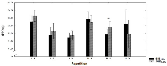 When analyzing the time to achieve PPO in each repetition, a statistically significantly shorter time of 25.5% was observed (p < 0.05, t = 2.3) during the second repetition of the second series at SIE10% compared to SIE7.5% (Figure 4). The time to achieve PPO was statistically significantly lower during the second repetition of series II during SIE10%.