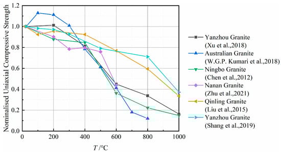 The variation law of the normalized uniaxial compressive strength with different temperatures in previous studies [15,19,20,21,22,23].