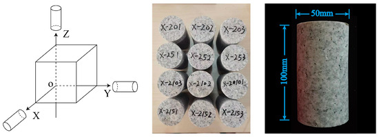 To reduce errors and external influencing factors in the experiment, all the rock samples used in this experiment were taken from the same granite block. According to the International Society for Rock Mechanics Test Specification (ISRM 2007), all the samples were φ A 50 × 100 mm cylinders. To study the anisotropy of the physical and mechanical properties of granite, samples were taken along the three orthogonal directions of granite, according to the sampling scheme in Figure 3. Seventy-two samples were processed in each direction, totaling 216 granite samples. According to the wave speed test results, the three directions are named in a descending order of the wave speed: the Z direction, X direction, and Y direction.