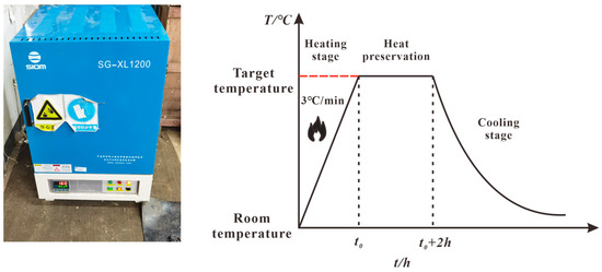 The experimental procedure was as follows: The rock samples were placed in a well-ventilated place at room temperature for 2 weeks to eliminate the influence of natural moisture content. As shown in Figure 4, the rock samples were placed into a high-temperature furnace according to temperature groups for heat treatment at a heating rate of 3 °C/min. After heating to the target temperature, the mixture was maintained at a constant temperature for 2 h. After the power was turned off, the samples were cooled naturally in the furnace to room temperature. Microscopic observation, wave velocity testing, and uniaxial and triaxial compression tests were carried out on the rock samples after high-temperature treatment, and the morphology of damaged samples was photographed.