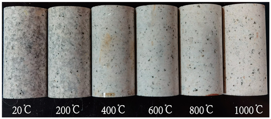 The surface color, tapping sound, and roughness of the granite rock samples after high-temperature treatment significantly changed compared to those of the untreated samples. Figure 5 shows the apparent color changes in some of the granite samples after being subjected to temperatures ranging from 20 °C to 1000 °C. The apparent color of the granite changed significantly with an increasing temperature. At room temperature, the granite grains appeared grayish white with a smooth surface. After heating at 200 °C, the color slightly shifted to white, and the knocking sound was crisp, indicating a smooth surface. After heating at 400 °C, the color changed to light flesh red with yellow spots, the knocking sound became turbid compared to before, and the surface was smoother. After heating at 600 °C, the overall color changed from gray to white, and the knocking sound became obviously cloudy, resulting in a rough surface. After heating at 800 °C, the white was lighter than that at 600 °C, and black substances appeared locally (which may appear on the surface where dark minerals melt and precipitate). The knocking sound was cloudy, the surface was rough, and the particles were difficult to erase. After heating at 1000 °C, the color of the granite became red compared with 800 °C, and the black material disappeared. The knock was very cloudy, and the surface was very rough and could be rubbed into particles.