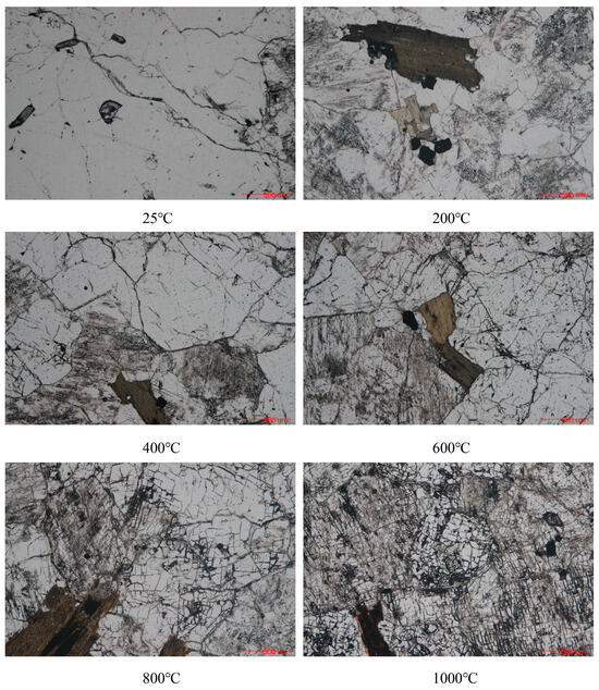 As shown in Figure 6, the morphological changes in the mineral composition and microcrack-development characteristics of the granite samples after high-temperature treatment were observed using an optical microscope, and optical microscopic images of the samples treated at different temperatures were obtained. For the convenience of statistics and resolution, intergranular cracks are marked in red, intragranular cracks in the quartz are marked in yellow, intragranular cracks in the feldspar are marked in green, and intragranular cracks in the biotite are marked in orange. The rock was mainly composed of plagioclase, potassium feldspar, quartz, biotite, and a small amount of opaque minerals. In the original state, the contact edges between minerals in the rock were straight or smooth, a small number of primary cracks were observed in the quartz and feldspar crystals, and intergranular cracks were also rare. After heating at 200 °C, a small number of cracks could be observed inside the plagioclase and quartz particles, and intergranular cracks were distributed at the boundaries of the plagioclase and quartz. Compared with those in the initial state, the morphology of each mineral did not change much, but some plagioclase particles were slightly fragmented. At 400 °C, fragmentation occurred at the contact points between various minerals in the rock, with a small number of cracks appearing inside the potassium feldspar and many light brown microcracks appearing inside the quartz particles. Compared with those of the samples at room temperature, the morphology of each mineral did not change much, with biotite showing a slight reddish-brown color, indicating oxidation and obvious fragmentation within each mineral. As the heating temperature increased to 600 °C, the fragmentation phenomenon at the contact points between minerals in the rock became more pronounced than that in the sample at 400 °C, and the number of microcracks in the feldspar minerals significantly increased. Black mica exhibits a more reddish-brown color and extensive oxidation. Due to the occurrence of quartz at the 573 °C α–β phase transition, at high temperatures, (β) the volume of the phase quartz particles increased and recovered after cooling to room temperature. (α) The process of the expansion and contraction of quartz led to an increase in the number of broken minerals at the boundaries of the quartz minerals, an increase in the crack width, and an increase in the number of intergranular and intragranular cracks. After heating at 800 °C, the morphology of the various minerals changed significantly, with a large number of intergranular and intragranular cracks appearing. The fragmentation phenomenon of the internal and contact parts between minerals was more obvious. After high-temperature treatment at 1000 °C, the surfaces of the potassium feldspar, plagioclase feldspar, and quartz all became blurred, indicating strong weathering. Black mica became redder and had a greater degree of oxidation than 800 °C, while the degree of fracture of black mica was also greater. The various mineral components in the rock exhibited a large number of intragranular cracks, which were interconnected. The width of the intergranular cracks reached the maximum among all temperature levels.