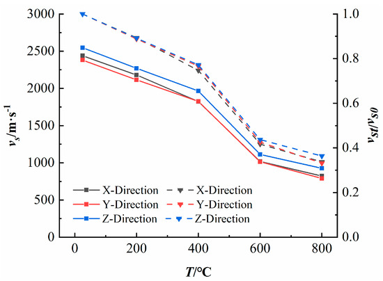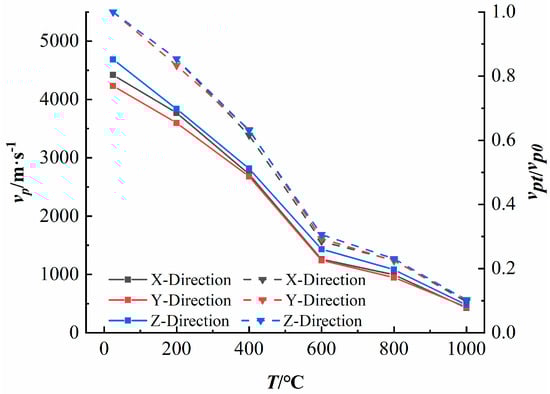 The law of the variation in wave velocity with different temperatures in the three orthogonal directions of granite can be summarized as follows: at room temperature, the Z-direction wave velocity was the highest, and the Y-direction wave velocity was the lowest. As the heating temperature increased, the longitudinal wave velocity of granite, in the first three sampling directions before 400 °C, decreased rapidly, and the Z direction had a faster deceleration rate, while the X direction and Y directions had a slower deceleration rate. The difference in the longitudinal wave velocity of granite in the three directions decreased rapidly, and the difference in the longitudinal wave velocity was the smallest at 400 °C. For the shear wave velocity, at 200 °C, the reduction rate of granite in the three directions was basically the same and still significantly different. At 400 °C, the reduction rate of the granite shear wave velocity in the X direction was significantly greater than that in the other two directions, rapidly decreasing to the same level as the shear wave velocity in the Y direction. When the temperature exceeded 400 °C, the variation patterns of the longitudinal and transverse wave velocities of granite in the three directions were basically the same. The wave velocities of granite in the X and Y directions tended to be consistent and significantly lower than those of granite in the Z direction. When the heating temperature reached 800 °C, the relationship between the longitudinal wave velocities of granite in the three directions was the same as that for normal temperatures, but the difference was not significant, while the transverse wave velocities of granite in the Z direction were still significantly greater than those in the other two directions.