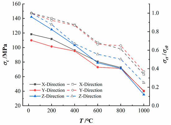Figure 10 illustrates the relationship between the uniaxial compressive strength of granite and temperature variation. As shown in the Figure 10, the uniaxial compressive strength of granite decreased with an increasing temperature, but the uniaxial compressive strength of granite sampled in the different directions shows different trends: At room temperature, the Z-direction granite had the highest strength, followed by the X-direction granite, and the Y-direction granite had the lowest strength. As the temperature increased from room temperature to 400 °C, the strength of the granite decreased. The difference in the uniaxial compressive strength of granite in the three directions rapidly decreased within this temperature range, and the strength of granite in the Z direction was slightly greater than that in the X and Y directions. When the temperature increased to 600 °C, the strength of granite in the three directions decreased rapidly, and the strength of granite in the Y direction was relatively lower than that in the other two directions. As the temperature continued to rise, after the high temperature increased to 800 °C and 1000 °C, the strength differences in the three directions gradually disappeared and tended to be consistent.