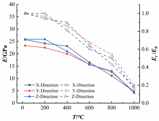 Figure 11 shows the relationship between the elastic modulus of granite and temperature variation. The elastic modulus of granite in the X direction was 25.74 GPa at room temperature, which slightly decreased before 400 °C and decreased to 23.14 GPa at 400 °C for a decrease of 10.15% compared to room temperature. When the temperature was above 400 °C, the elastic modulus decreased almost linearly and dropped to 4.75 GPa at 1000 °C, a decrease of 81.54% compared to room temperature. The elastic modulus of granite in the Y direction at room temperature was 23.30 GPa, which was slightly lower than that in the X direction. As the temperature increased, the rate of decrease in the elastic modulus gradually accelerated. At 400 °C, the elastic modulus of granite in the Y direction was 20.03 GPa, which was 14.06% lower than that at room temperature. When the temperature increased to 800 °C, the rate of decrease in the elastic modulus slowed down compared to that at 600 °C. When the heating temperature exceeded 800 °C, the elastic modulus rapidly decreased again. At 1000 °C, the elastic modulus of the granite decreased to 4.62 GPa, which was 80.26% lower than that at room temperature. The elastic modulus of granite in the Z direction at room temperature was 25.88 GPa, which was the maximum value in the three sampling directions. As the temperature increased, the elastic modulus of the granite increased slightly at 200 °C. Within the temperature range of 200–600 °C, the elastic modulus decreased approximately linearly, with the fastest rate of decrease among the three directions. Compared to those at room temperature, the reduction amplitudes at 400 °C and 600 °C were 18.85% and 39.67%, respectively, which were significantly greater than those in the other two directions. As the temperature continued to increase, the variation in the elastic modulus with different temperatures was approximately in the Y direction. At 1000 °C, the elastic modulus decreased to 4.16 GPa, a decrease of 83.94% compared to room temperature.