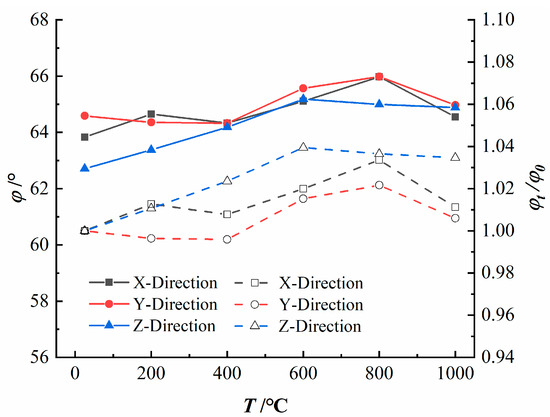 Figure 12 shows the variation trend of the internal friction angle of the rock samples in the different sampling directions with an increasing temperature, as well as the normalized internal friction angle with temperature variation. As shown in Figure 12, the internal friction angle of the rock samples in all three directions showed an overall upwards trend with an increasing temperature, indicating that a high temperature slightly increased the internal friction angle of the granite. Under normal temperature conditions, the internal friction angles of the granite in the three directions were arranged in descending order: Y direction > X direction > Z direction. As the temperature increased to 800 °C, the internal friction angle of the X-direction rock sample first increased, then decreased, and then increased again, while the internal friction angle of the Y-direction rock sample first slightly decreased. After 400 °C, the internal friction angle of the Z-direction rock sample increased at a relatively rapid rate, and it approximately linearly increased until it slightly decreased above 600 °C. When the temperature increased to 1000 °C, the internal friction angle of the rock samples in the three directions decreased to different degrees, but the values were still greater than those of the original state. Specifically, at 1000 °C, the feldspar melts formed a smooth glaze surface, resulting in a decrease in the friction coefficient and a decrease in friction between the mineral components. However, due to the high-temperature treatment, a large number of cracks were generated, minerals were broken, and small mineral particles filled the cracks. The friction characteristics of the particles were improved compared to those in the initial state. Therefore, compared with that at 800 °C, the internal friction angle at 1000 °C decreased but was still greater than that in the initial state.