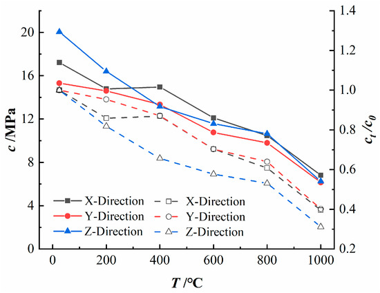 Figure 13 shows the variation in cohesion with different temperatures in the rock samples from the different sampling directions, as well as the trend in cohesion with an increasing temperature after normalization. Although the cohesion of the rock samples from all three sampling directions decreased overall with an increasing temperature, there were differences in the variation patterns of the different temperature ranges. At 200 °C, the cohesion of the rock samples in all three sampling directions showed a decreasing trend, but the rate of decrease in the Y direction was significantly lower than that in the other two sampling directions. At 400 °C, the cohesion of the rock samples in the X direction slightly increased, while the cohesion of the rock samples in the other two directions continued to decrease. The decrease in cohesion of the rock samples in the Z direction was much greater in this temperature range than in the other two directions. As the temperature continued to increase, the cohesion of the rock samples in the three directions decreased steadily, and the rates of decrease were relatively close. The effects of temperature on the cohesion of the rock samples in the different sampling directions tended to be consistent. The normalized results reveal that the cohesion of the Z-direction rock sample was more sensitive to a high-temperature response than was that of the other two directions. As the temperature increased, the decrease in cohesion of the Z-direction rock sample relative to the initial state was significantly greater than that of the other two directions.