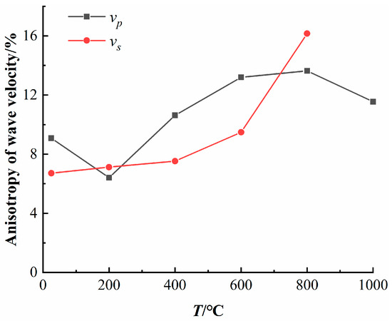Figure 14 illustrates the variation of the granite wave velocity anisotropy with different temperatures. At a heating temperature of 200 °C, the granite’s anisotropy decreased. This decrease in wave velocity was attributed to the removal of free water and weakly bound water from primary fractures within the granite. On the other hand, an increase in the temperature led to the expansion and mutual compression of mineral particles, which could cause some cracks to be compressed or even disappear. This phenomenon was random and irregular, resulting in a decrease in the anisotropy of the granite wave velocity at 200 °C. As the heating temperature increased, the anisotropy of the two types of rocks gradually increased. New microcracks were generated and propagated along the weakest surface of the mineral crystals and might have also connected to form large cracks. At 400 °C, the anisotropy of the granite wave velocity increased. At 600 °C, the anisotropy of the longitudinal wave velocity in the granite reached its maximum value, which was significantly greater than that at room temperature. After heating above 800 °C, the anisotropy of the longitudinal wave velocity in the granite decreased but was still greater than that in the normal temperature state. It can be inferred that temperatures above 400 °C can amplify the anisotropy of the longitudinal wave velocity in granite.