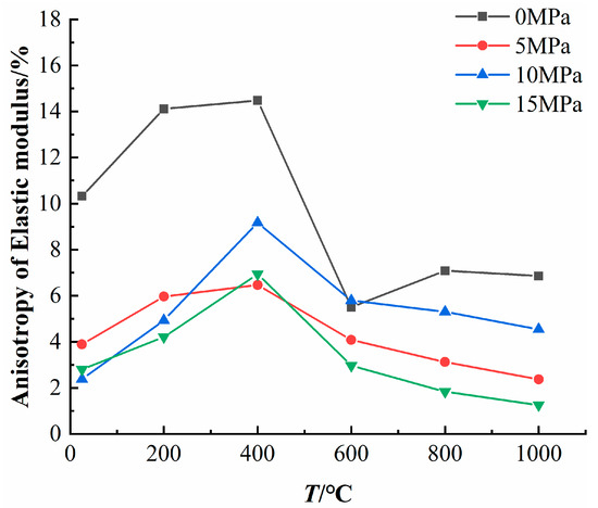 Figure 16 shows the variation in the anisotropy of the elastic modulus with different temperatures. Under various confining pressure conditions, the anisotropy of the granite elastic modulus remained basically unchanged with different temperatures, and the anisotropy of the elastic modulus first increased and then decreased with an increasing temperature. The degree of anisotropy reached its maximum value at 400 °C, and as the temperature continued to rise, the degree of anisotropy began to decrease. As the confining pressure increased, the degree of anisotropy gradually decreased, indicating that a confining pressure can constrain the expression of anisotropy in the elastic modulus of granite. Under uniaxial conditions and a confining pressure of 5 MPa, there was little difference in the anisotropy of the elastic modulus between 200 °C and 400 °C. At the confining pressures of 10 MPa and 15 MPa, the anisotropy of the elastic modulus increased at 400 °C, compared to that at 200 °C. This phenomenon indicates that the confining pressure has a slight enhancing effect on the anisotropy in the temperature range of 200~400 °C.