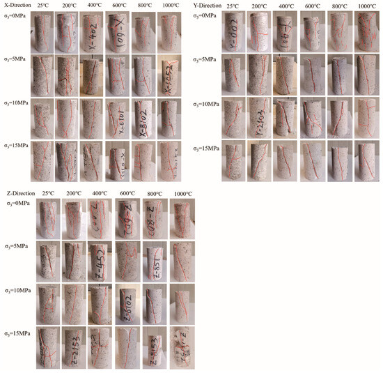 The failure mode of granite is influenced by three factors: temperature, sampling direction, and confining pressure. Figure 17 shows photos of the failure modes of the granite in the three sampling directions under different temperatures and confining pressures. As the temperature and confining pressure increased, in the same sampling direction, the failure mode of the rock samples obviously changed from brittle failure to ductile failure. The failure mode of the granite under uniaxial conditions was mostly tensile splitting failure, while under triaxial compression conditions, the failure mode was shear failure. Although the failure modes of the rock samples in the different sampling directions were the same, there were certain differences in the morphology of the fracture surface.
