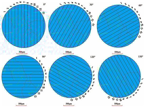 In this article, we selected a circular analysis area with a diameter of 2.04 mm to analyze the distribution characteristics of microcracks in the entire cross-section of the sample as much as possible. According to the microscopic crack density statistical method, we set 13 reference lines, numbered 1–13, with a spacing of 150, as shown in Figure 18 (μm). The length of each reference line is shown in Table 1.