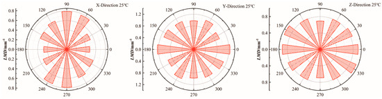 Figure 19 shows the distribution of the crack density on the granite cross-sections in the three sampling directions under room-temperature conditions. The rock samples were sampled along the X and Y directions. In the initial state, the distribution of primary cracks on the cross-section of the rock sample was significantly greater in one direction than in other directions. When turning from the angle with the lowest crack density to the angle with the highest crack density, the crack density showed an increasing trend from small to large; this also indicates that there was an advantageous direction of crack distribution on the cross-section of the rock samples in the X and Y directions. However, there was no obvious dominant distribution direction of the crack density on the cross-section of the rock samples sampled along the Z direction, and when rotating from the direction of minimum crack density to the direction of maximum crack density, the crack density did not follow the law of numerical increase. The distribution of the crack density was relatively chaotic, and no obvious trends were observed. Based on these findings, we can determine that the X and Y directions are perpendicular to the dominant crack development direction, while the Z direction is parallel to the dominant crack development direction.