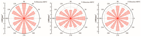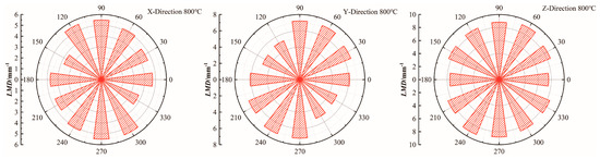 According to the above method, the crack distribution status of the rock samples from the three sampling directions was analyzed after different temperature treatments, and the average microcrack density of 13 reference lines was calculated at the 0°, 30°, 60°, 90°, 120°, and 150° reference line angles. When drawing, 30° is taken as the interval, and the reference line angle range is 0° to 180°, which is mapped to the range of 180° to 360°. A polar coordinate graph of the reference line angle microscopic crack density was drawn, as shown in Figure 18.