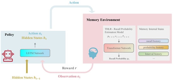 To address the above challenges, we propose the DRL-SRS framework, which stands for the deep reinforcement learning approach for optimizing spaced repetition scheduling framework. The framework contains two modules. Our work first introduces the Transformer-based Half-Life Regression (THLR) model, which predicts the half-life of learning items with greater accuracy than traditional models based on real-world data. By capturing the temporal dynamics of recall likelihood, THLR provides a more nuanced understanding of the process of forgetting. Furthermore, following the problem definition of SSP-MMC [], we develop a simulation environment that emulates the learner’s daily review process, considering both inter-day and intra-day time dynamics. Although previous works have tried simulating student interactions for educational systems [], they are not feasible for spaced repetition optimization. Lastly, we propose a deep reinforcement learning model for spaced repetition optimization based on a Deep Q-Network (DQN) augmented with a Long Short-term Memory (LSTM) mechanism.