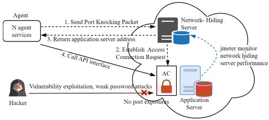 To test the performance of AHAC, we constructed an experimental environment as shown in Figure 3. In the same experimental environment, we validated the load performance of AHAC and SPA. This environment consists of two core deployment areas: the Agent Deployment Area and the Network-Hiding Deployment Area.