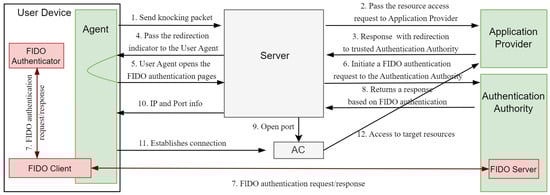 By integrating FIDO with AHAC, this shortcoming is well mitigated, providing a more comprehensive solution for internet exposure defense. The implementation scheme is shown in Figure 8, with the specific implementation steps as follows.