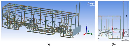 This research will simulate the behavior of the body frame of a low-entry city bus (JSC “Ukrbusbusprom”—model 4289) in UNECE R29 frontal collision conditions (Figure 1a).